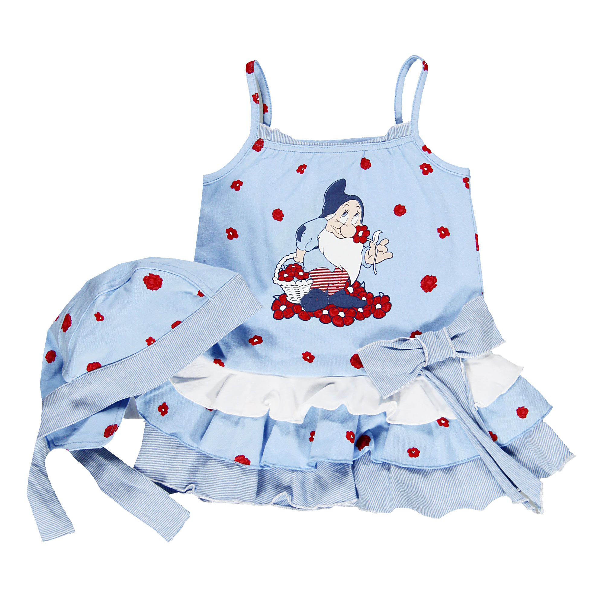 Очень красивый, просто слов нет какой великолепный комплект из замечательной пляжной коллекции про гномиков! Состоит из сарафанчика и банданы, необыкновенного, очень красивого голубого цвета в контрастный цветочный принт.