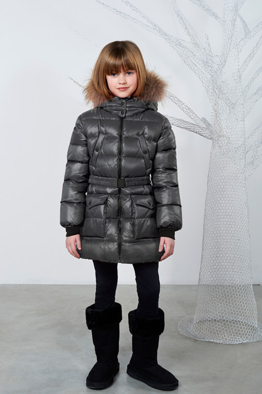 Down parka with detachable hood and detachable fur. Cuffs and hood's profiles made of stretch fabric, water repellent. Frontal fastening with zipper and belt.