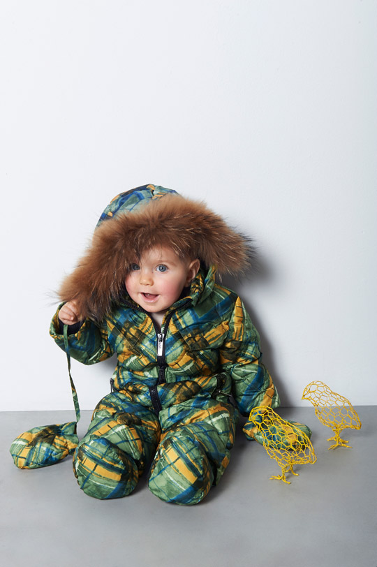 Down overall with detachable hood and detachable fur. Made of printed fabric, water repellent. Frontal fastening and pockets with zipper.